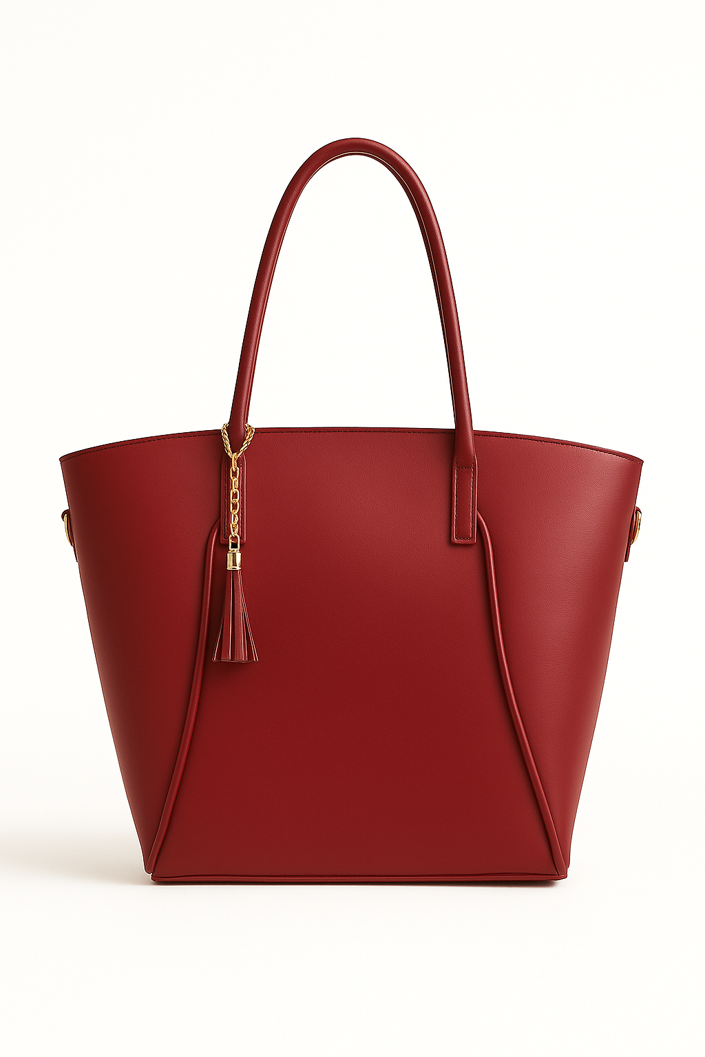 Make a fierce fashion statement with the Urban Red, a bold and elegant tote bag crafted for everyday sophistication. Designed with sleek faux leather in a deep, striking red, this structured tote features tapered sides, gold-tone detailing, and a removable tassel charm for added flair. Its spacious interior and top zipper closure keep all your essentials secure—whether you’re carrying a laptop for work, notebooks for class, or makeup and accessories for a night out. Comfortable top handles allow for easy shoulder wear, while the clean silhouette complements both eastern and western attire. The Urban Red is perfect for Pakistani women who want to exude confidence while staying effortlessly organized and stylish throughout the day.